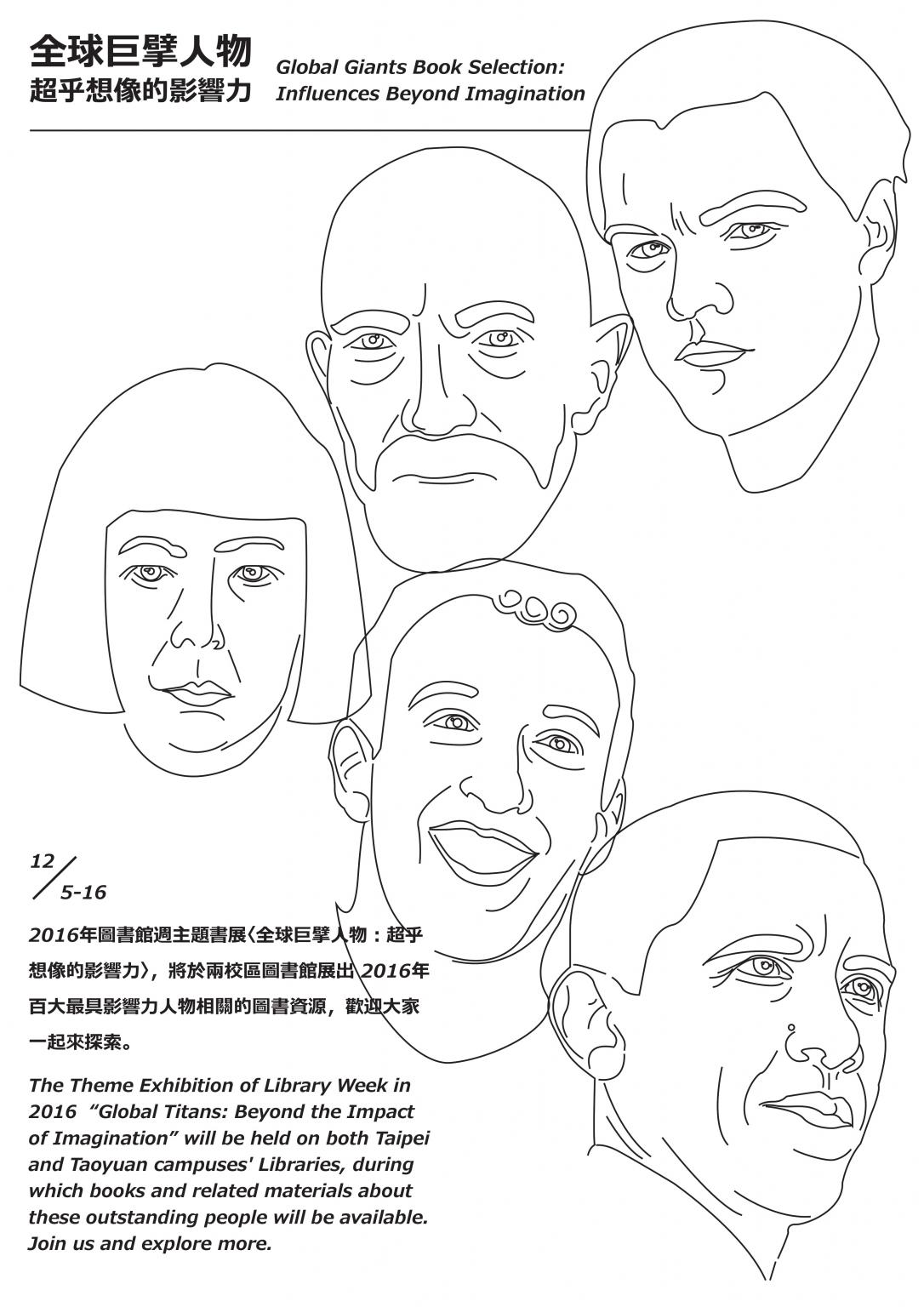 Most people’s lives will be forgotten in the passing of time, no matter how significant the achievements they made. However, there is a group of people from various fields with different backgrounds and values, who have done some things to change the world and affect our generation a lot. Time Magazine has published Time 100 since 2004, which annually selected the top 100 global titans who have impacted the world a lot. They are separated into five types, pioneers of promoting the era, titans with great achievements, artists with outstanding contributions, leaders of revolutions and icons who are indicative symbols of the era, no matter whether for good or bad. These people who can impact the world must possess something valuable for us to learn. The Theme Exhibition of Library Week in 2016 “Global Titans: Beyond the Impact of Imagination” will be held on both Taipei and Taoyuan campuses on 12/5-16, during which books and related materials about these outstanding people will be available. Join us and explore more.