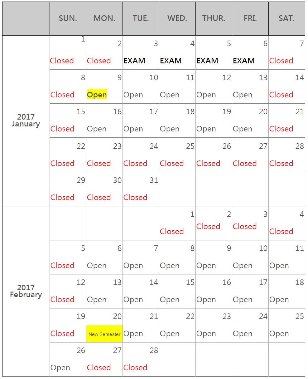 - Winter Session Service Hours: Taoyuan Campus 8:30-16:40; Taipei Campus 8:30-17:00; from Monday to Friday. Closed from January 21 to February 5.(Winter Break starts at Jan. 9)
